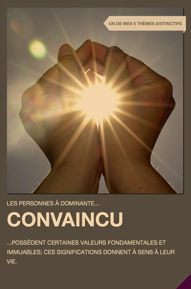 Je suis guidée et motivée par les causes, les objectifs et les valeurs importantes. Cet enthousiasme et ce mélange d'espoir et de but est souvent contagieux, attirant d'autres personnes à leur raison d’être et visées. J'amène les gens à reconnaître l'ensemble des valeurs fondamentales qui définissent leur vie et leur contribution à la société; je les aide à faire le lien entre le travail quotidien et la mission plus large de l'organisation. Je prospère dans les relations avec des dirigeants qui partagent leurs sentiments et convictions ainsi que leur engagement envers une culture claire. De plus, je les encourage à trouver des moyens de se connecter de façon significative avec leur entourage.